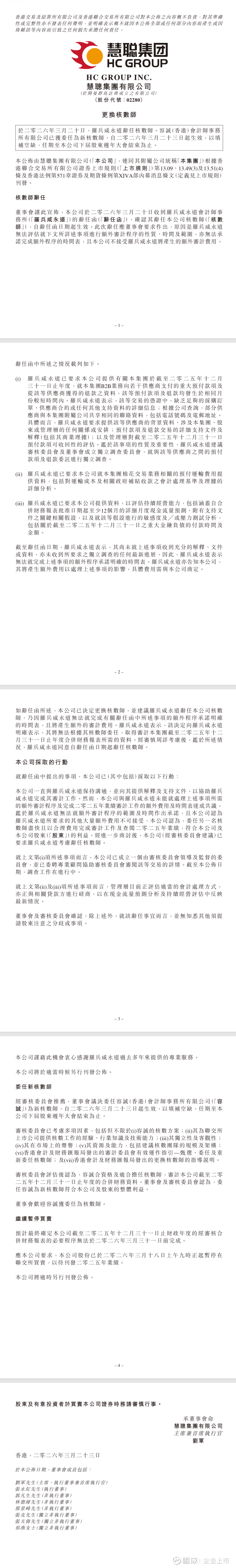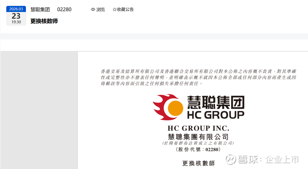 慧聪集团(股票代码:02280)发布公告称,原审计师罗兵咸永道(普华永道)已于2026年3月20日辞任,新审计师容诚(香港)会计师事务所于3月23日接任。