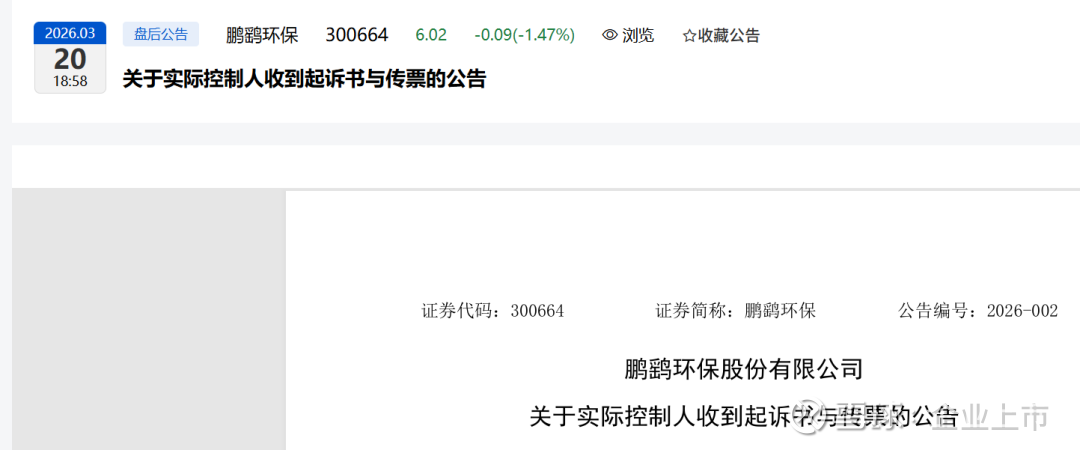 鹏鹞环保股份有限公司(以下简称“公司”)今日收到公司实际控制人之一王洪春先生的通知,其于2026年3月19日收到江苏省无锡市人民检察院《起诉书》(锡检刑诉〔2026〕5号)与江苏省无锡市中级人民法院《传票》(案号:(2026)苏02刑初11号),王洪春先生因涉嫌内幕交易罪被提起公诉。