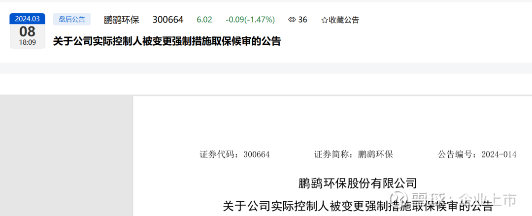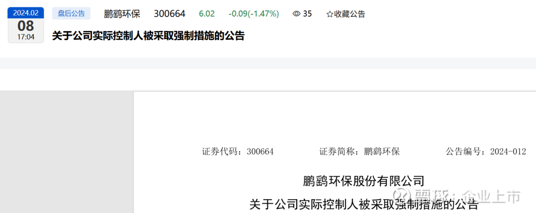 鹏鹞环保股份有限公司(以下简称“公司”)于2024年2月8日发布了《关于公司实际控制人被采取强制措施的公告》(公告编号:2024-012),披露公司实际控制人之一王洪春先生因涉嫌内幕交易罪被无锡市公安局刑事拘留。