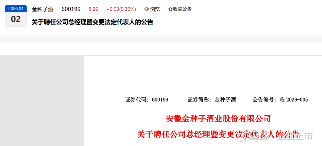 安徽金种子酒业股份有限公司于2026年4月1日召开第七届董事会第二十次会议,审议通过了《关于聘任公司总经理暨变更法定代表人的议案》,现将相关情况公告如下: