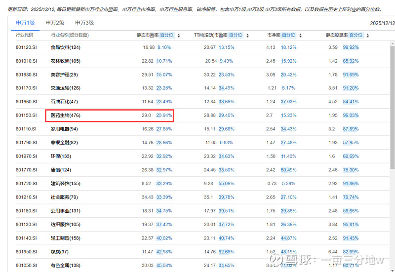 $华润双鹤(SH600062)$ 截至上周五,申万一级行业按静态市盈率百分位排名“生物医药行业”排第五,大概位于历史29%的位置;