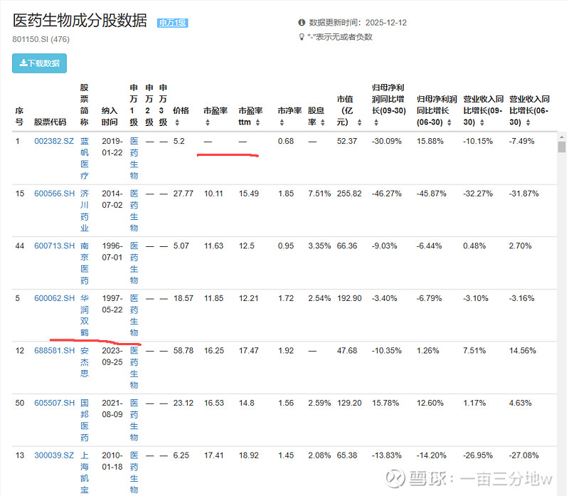 该板块共476只股票,2024年只有一家亏损的公司;按静态市盈率由低到高的排名,华润双鹤以不到11的PE排名第三。但是双鹤去年净利润16.3亿,赚钱的绝对金额可以排进生物医药公司前20名。