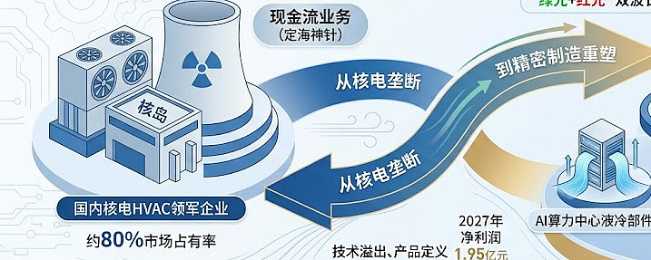 二、表层分析 从财务视角看,这是一家典型的成长性业务的转型案例。 核电HVAC业务作为公司的传统基本盘,提供了极其稳定的现金流。在核电这种长周期、高准入门槛的行业中,80%的市占率意味着南风股份已经构筑了极高的行业壁垒。 从技术视角看,3D打印的切入并非跨界“玩票”,而是制造工艺的范式转移。 传统减材制造(CNC加工等)在面对AI液冷冷板或航天发动机喷管这类内部结构极其复杂的精密部件时,往往面临材料损耗率高、加工极限受限的问题。南风股份采用的“绿光+红光”并行方案: 绿光技术: 主要针对铜等高反射金属材料。在AI服务器散热和汽车IGBT领域,纯铜是核心介质,但传统激光对铜的吸收率极低,绿光激光器则能显著提升加工效率与质量。 红光技术: 针对不锈钢、钛合金等传统金属材料,成熟度高,适合大规模结构件生产。 从市场视角看,公司选定的四个赛道(核电、航天、AI液冷、新能源车)具有高度的“抗周期性”与“高成长性”共识。 这不仅是产品线的扩张,更是从单一的工业空调供应商向“复杂热管理与精密构件解决方案商”的身份跃迁。