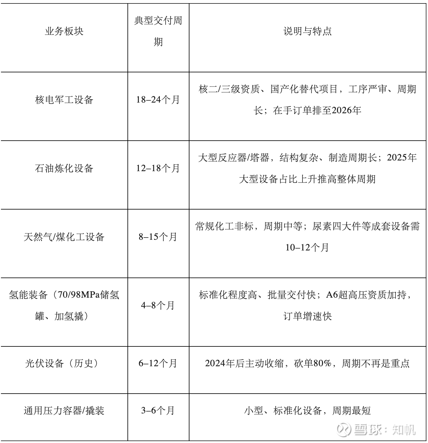 新能源高端装备领域大幅萎缩,石油炼化设备领域呈现大幅增长,整体营收波动较大,与其采用“订单式生产”的经营模式有关,订单根据业务呈现交付周期差异化分层:核电与超高压设备最长、化工炼化类中等、氢能撬装类相对较短,整体以订单式排产、12-24个月为主周期。
