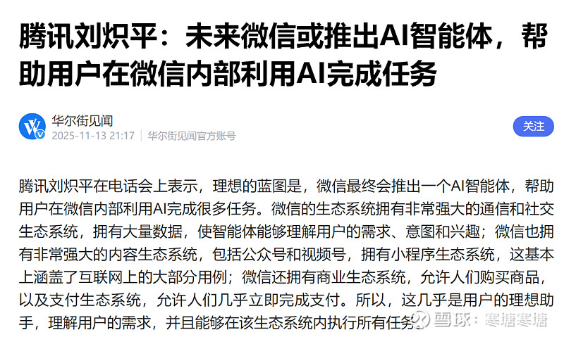 腾讯刘炽平:未来微信或推出AI智能体,帮助用户在微信内部利用AI完成任务。