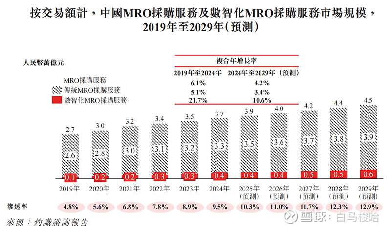 按照京东工业招股书里的数据,中国MRO市场2024年是3.7万亿元,到2025年增长至4.5万亿。而目前数智化MRO采购服务,即互联网化服务渗透率尚不足10%。行业发展空间巨大。
