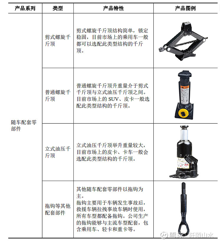 2、随车配套零部件。各大整车厂随车配备的千斤顶举升设备,以及拖钩等配套配件,用于车辆出现状况时的应急维修,比如路上爆胎后的轮胎更换等。