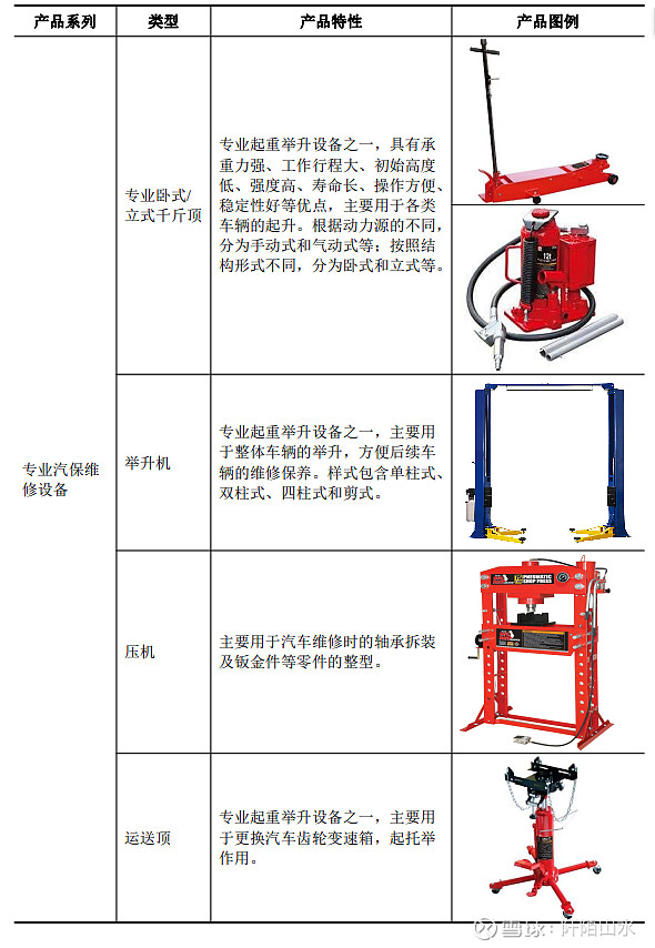 3、专业汽保 维修设备。面向汽保维修客户(比如汽修店)的各类起重举升设 备,主要包括专业卧式千斤顶、专业立式千斤顶、举 升机、运送顶、压机、分离顶等多个系列和产品。