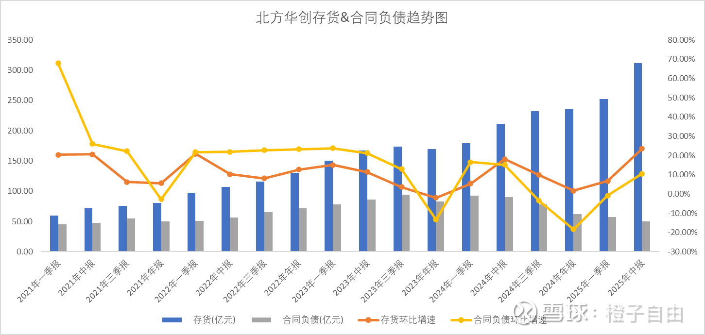 将2021/1/1-2025/06/30资产负债表中存货与合同负债季度余额进行趋势分析,北方华创公司存货季度余额近五年逐期增加,2025年二季度环比增速达到23.51%。
