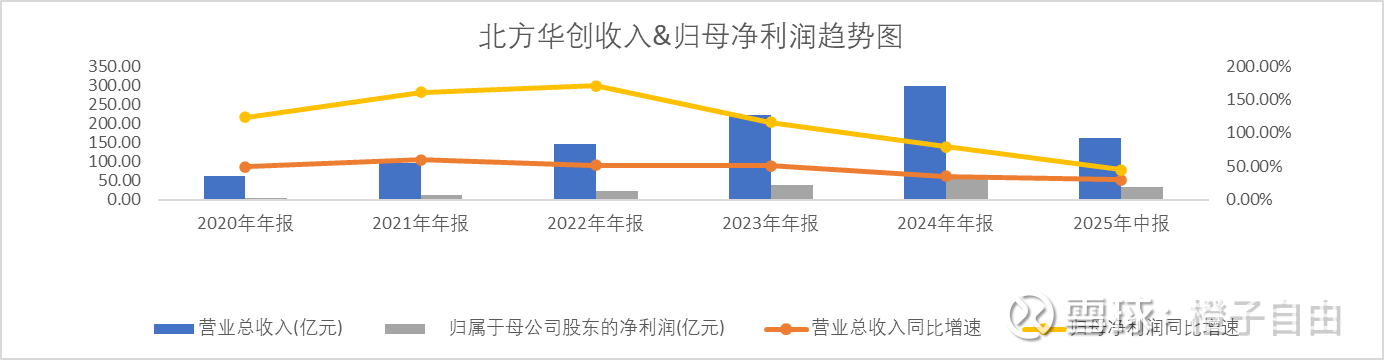 将2021/1/1-2025/06/30利润表中营业收入与归母净利润进行趋势分析,公司2020-2024年营业收入年均增长率为48.98%,2020-2024年归母净利润年均增长率为79.88%。2025 年上半年,公司实现营业收入 161.42 亿元,同比增长 29.51%;归母净利润 32.08 亿元,同比增长14.97%,增速有所下滑。