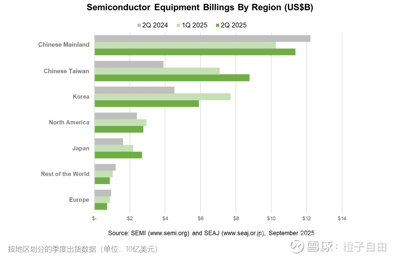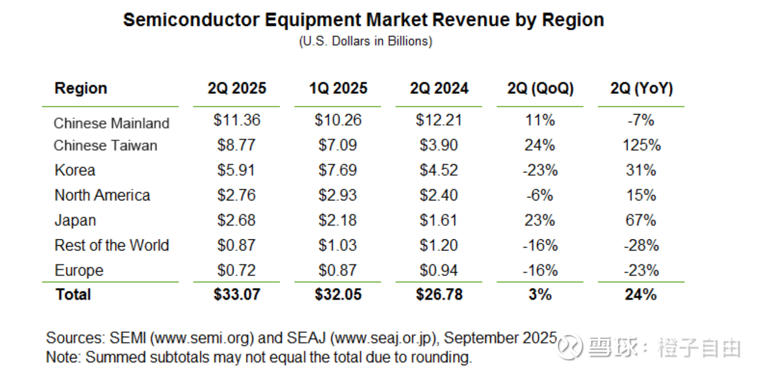 美国加州时间2025年9月4日,SEMI在《全球半导体设备市场报告》Worldwide Semiconductor Equipment Market Statistics (WWSEMS) Report中宣布,2025年第二季度全球半导体设备出货金额达到330.7亿美元,同比增长24%。受先进逻辑制程、HBM相关DRAM应用以及亚洲地区出货量增加的推动,2025年第二季度销售额环比增长3%。