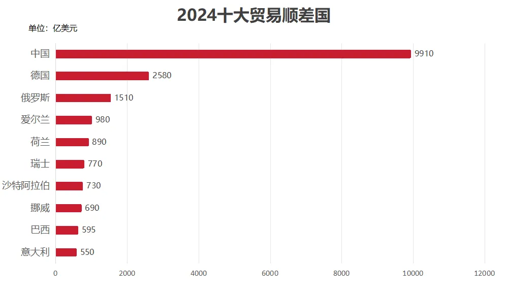 把2024全球前十大贸易顺差国拉出来排个序,中国一家的顺差比剩下9家加起来还多,