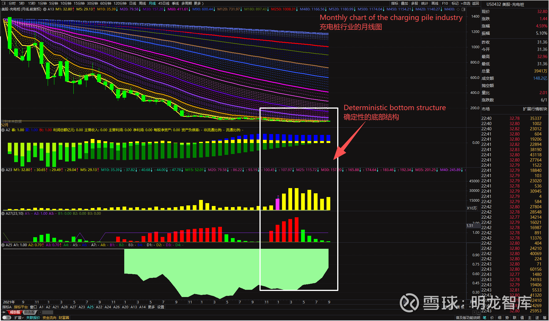 上图为充电桩行业月度走势图。请重点研究月度主图表指标及附图表指标对趋势底部结构的确认特征。该特征适用于全球任何指数、任何投资产品。