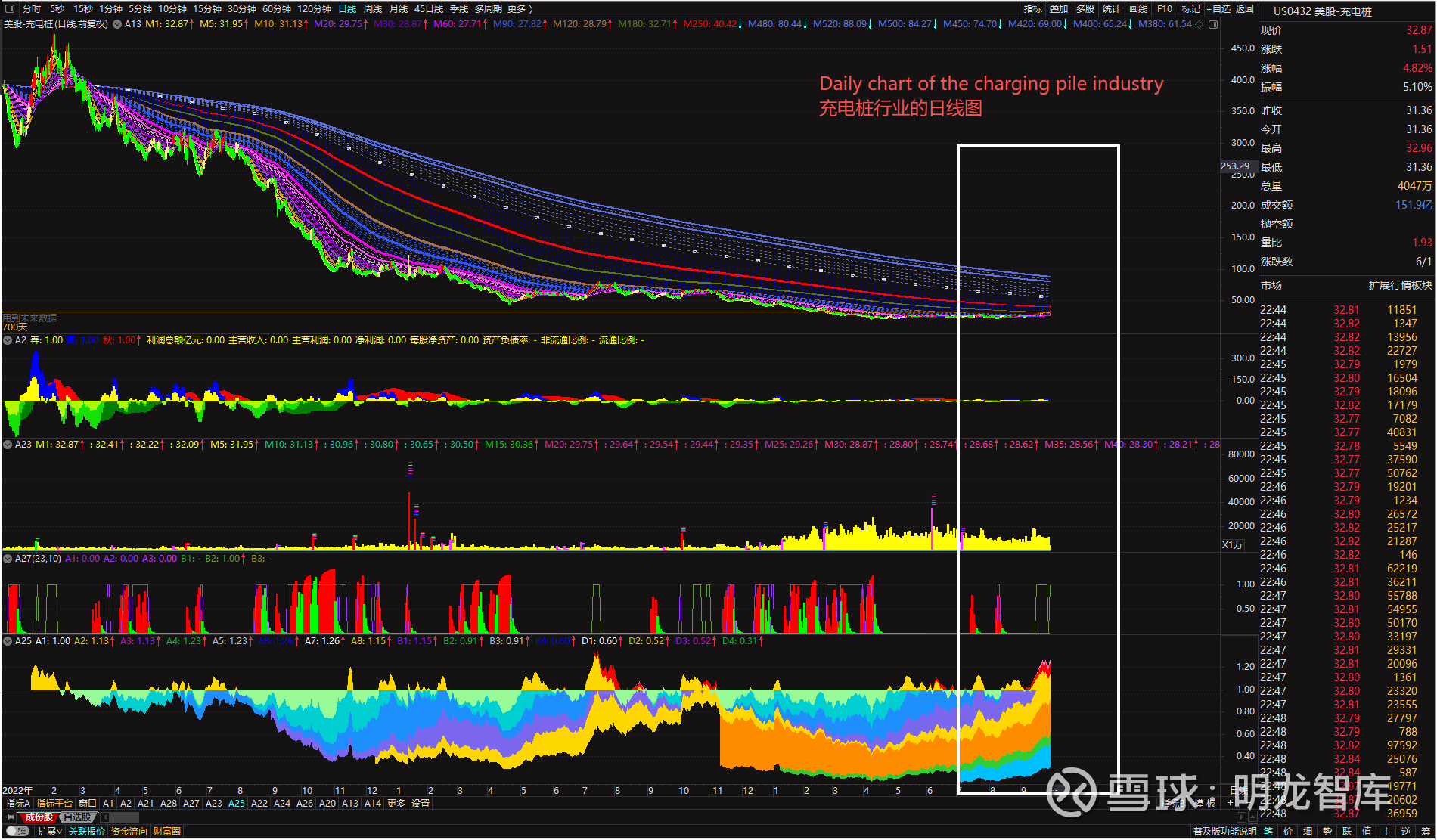 上图是充电桩行业的周线级别趋势图,在投资过程中我们必须首先确认投资标的所在行业的月线级别、周线级别、日线级别、三级趋势是从底部开始向上的,完成多周期趋势排查才能够保证投资行为是安全的。