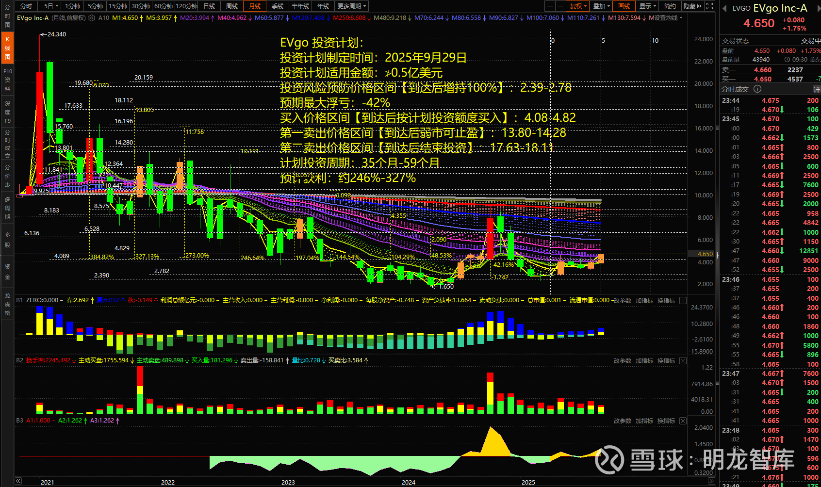 以上是EVgo公司的月线级别趋势图,基于对行业趋势和上市公司趋势以及上市公司估值的综合判断,在未来3~5年里公司的估值预计在150亿美元左右,保守测算公司股价预期在25元左右是比较合理的。因此具体的投资过程管理需要对资金行为和月线级别趋势进行持续监测,以保障投资过程中抓住最佳退出时机。