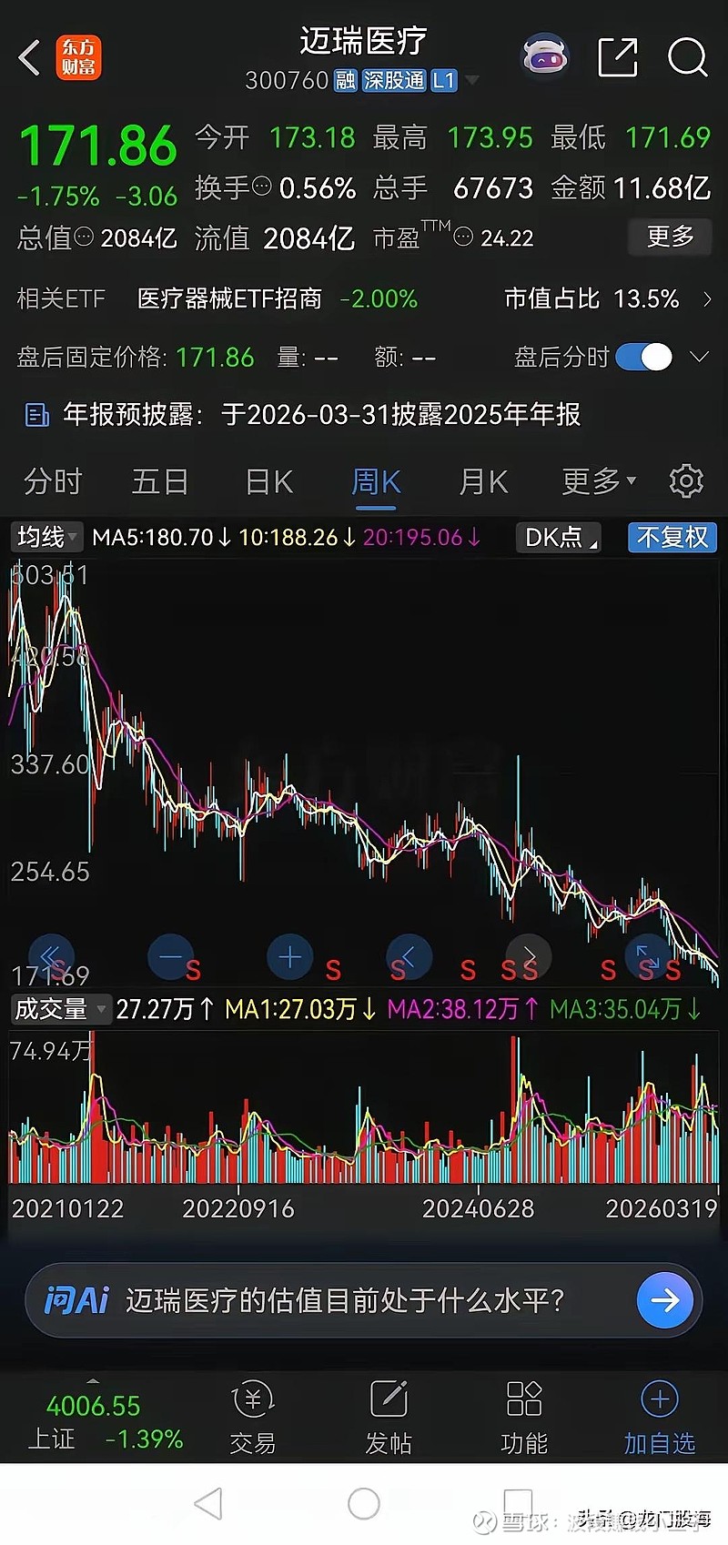 去年大盘一路高歌猛进,上证指数创出了近十年的新高,而迈瑞医疗却逆势下跌一路见新低。昨天收盘公司股价报收于171.86元,再次创出新低,这个价格比2024年9月份大盘2600多点时的最低价还下跌了23%,相当于2400点以下了,至少落后大盘1600点,而近6年来进场股民,现在全部被套牢,无一幸免!