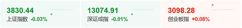 #金融早盘# 今早开盘,三大指数开盘涨跌不一,沪指低开0.03%,深成指低开0.01%,创业板指高开0.08%。CPO、AMD概念等板块指数涨幅居前,影视院线、减速器等板块指数跌幅居前。