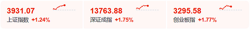 #金融午盘# 市场早盘震荡反弹,上证指数涨逾1%,时隔10年再度突破3900点。沪深两市半日成交额1.72万亿,较上个交易日放量3547亿。盘面上热点快速轮动,核电概念股集体大涨掀起涨停潮,芯片产业链爆发,有色金属板块反复活跃。下跌方面,影视院线概念股重挫。板块方面,有色金属、核电、存储芯片等板块涨幅居前,影视院线、旅游等板块跌幅居前。截至收盘,沪指涨1.24%,深成指涨1.75%,创业板指涨1.77%。