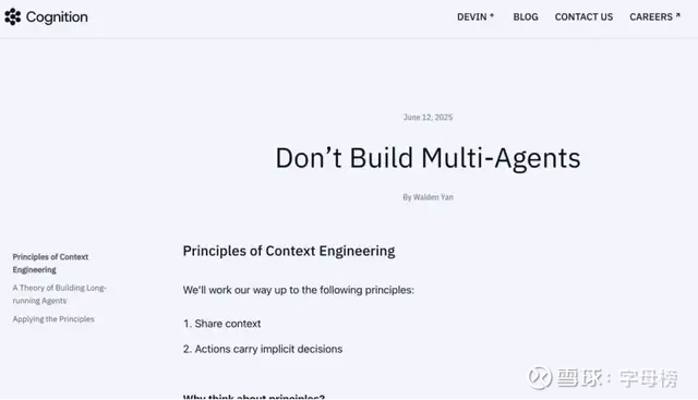 那是在2025年6月,Cognition官方下场,撰写文章《不要构建多智能系统》。他们主张用单一智能体+强大的上下文工程来实现长期可靠的agent行为,尤其适合深度、连续、顺序性强的任务,如软件工程、编码全流程。