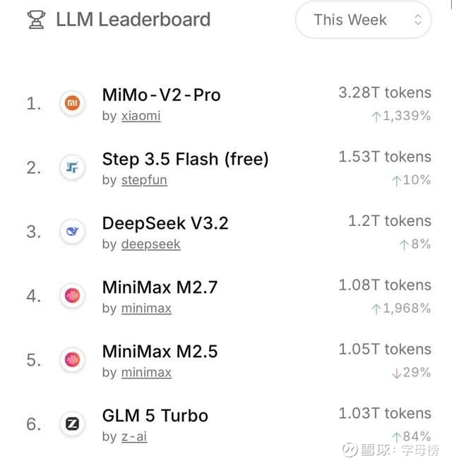 和罗福莉现身同步的是MiMo-V2-Pro近期在模型市场的火热表现。OpenRouter最新周榜数据显示,小米MiMo-V2-Pro模型拿下周榜第一,成为OpenRouter史上首个周Token消耗量超3万亿的模型。