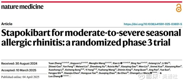 1.Zhang, Y., Li, J., Wang, M. et al. Stapokibart for moderate-to-severe seasonal allergic rhinitis: a randomized phase 3 trial. Nat Med (2025). 网页链接
