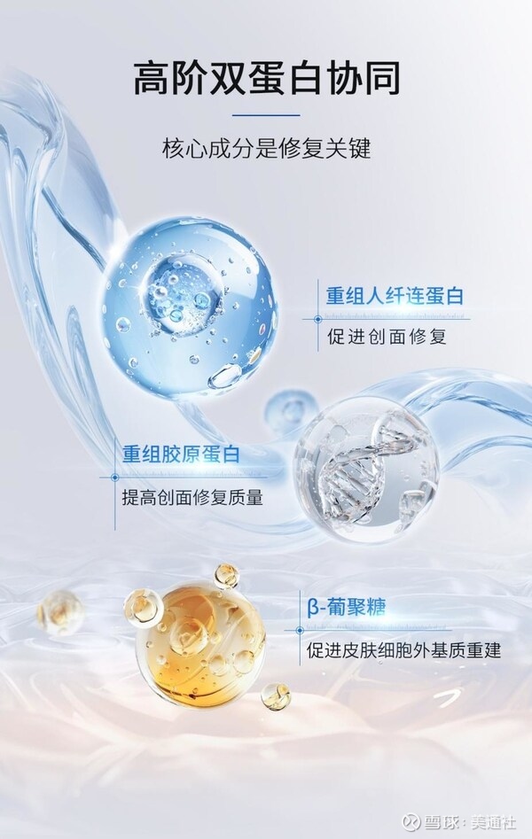 此次全新上市的双蛋白医用修复系列,则以双蛋白技术进一步填补了矩阵中"精准修护" 的核心需求,与水乳膏系列形成"基础加固 + 精准突破"的协同效应。系列中的重组人纤连蛋白作为细胞外基质的关键成分,堪称肌肤修护的 "生物粘合剂",能快速在创面或受损皮肤表面形成保护膜,通过多条通路激活成纤维细胞活性,加速上皮组织再生;重组胶原蛋白与人源序列 100% 同源,经优化筛选的活性序列可与 11 种整合素结合,为肌肤搭建 "修护骨架",增强角质层韧性;β- 葡聚糖则专注于"促进皮肤细胞外基质重建",为双蛋白的构建修护作用深层支撑环境。协同实现"即时防护+长效修复+基质重建"的多重效果,精准适配医美术后创面护理、轻创面愈合等核心需求。