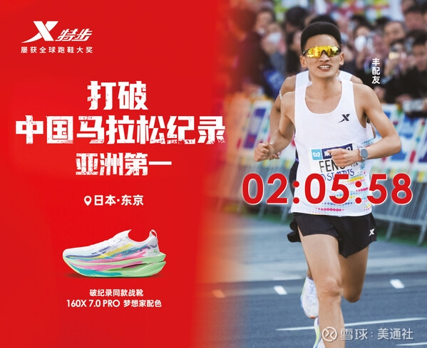 同日,东京马拉松赛场传来重磅喜讯:特步跑步代言人丰配友脚踏特步冠军版跑鞋160X 7.0 PRO梦想家配色,以2小时05分58秒的成绩刷新中国男子马拉松纪录,斩获本场亚洲籍运动员第一。这一里程碑式成绩,正式将中国男子马拉松带入"205时代",在世界赛道上彰显了强劲的中国速度与特步的专业科技实力。