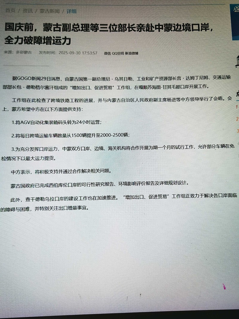 11月6日甘其毛都口岸通车数达1584车,创历史新高,估计领导的视察起效了….