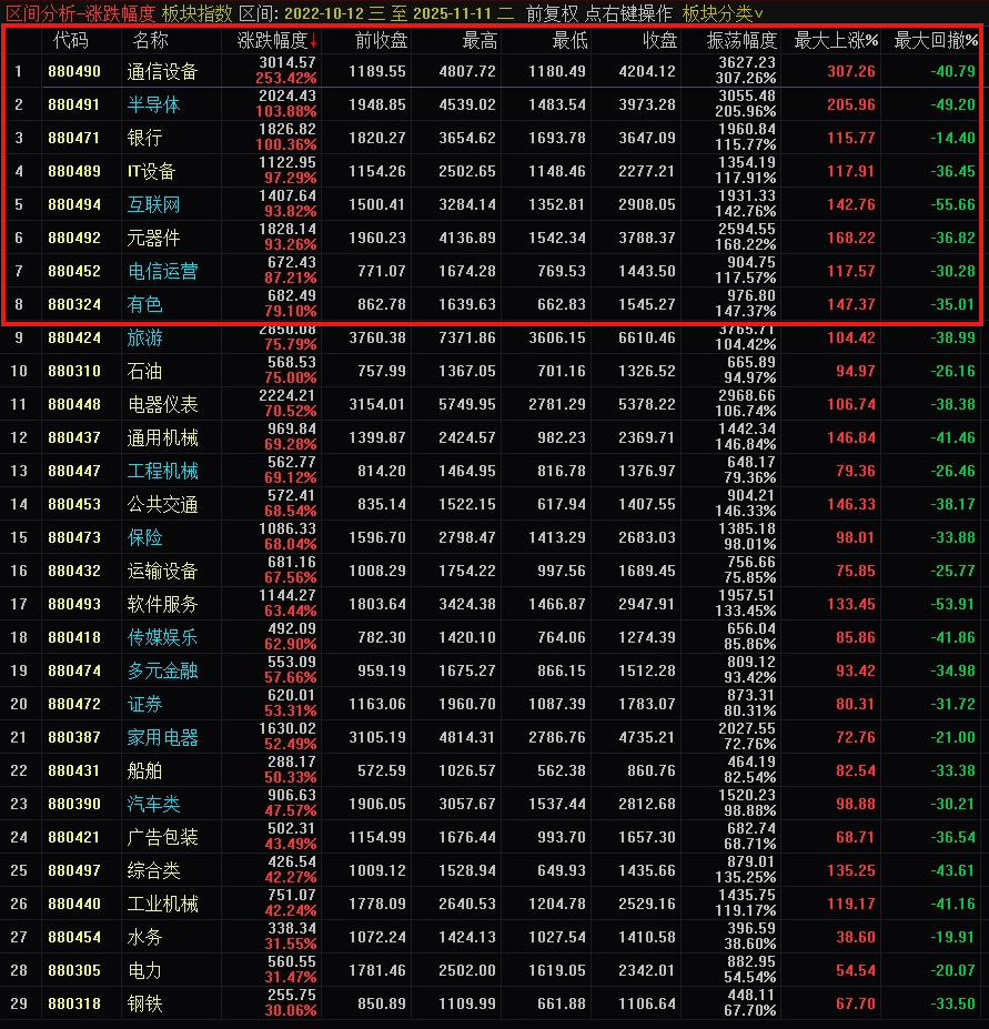 依照我的理论,A股进入下一轮牛市,一般来说都是上一轮涨幅最小的板块。如果我说的2026熊市为真,牛市里没涨的,熊市里有可能不跌。比如2022年年煤炭等高股息板块。
