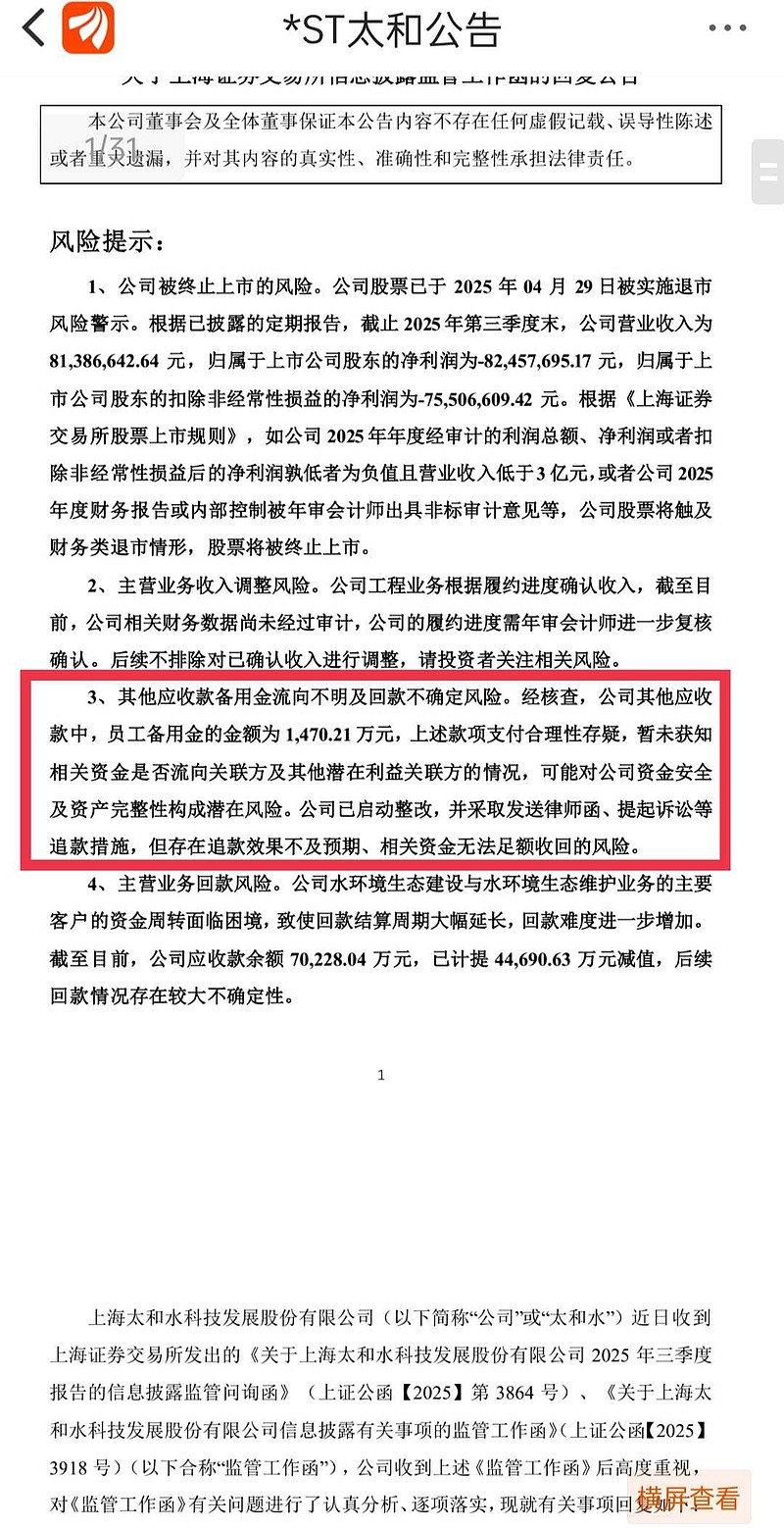 $*ST太和(SH605081)$ 这个股大家不用急着按计算器,它真正的大问题在这里啊,如果这1470万去向不明(猜测是之前的大股东非法占用)的员工备用金在年报之前追不回来,年报100%要被非标抬走,因为只要当年出现非法占资的情况,不论金额大小,年报一律非标。参考例子:*st恒久,恒久的子公司总经理刘志雄在2022年非法侵占670万公司货款,恒久当年的年报内控被非标带帽至今。