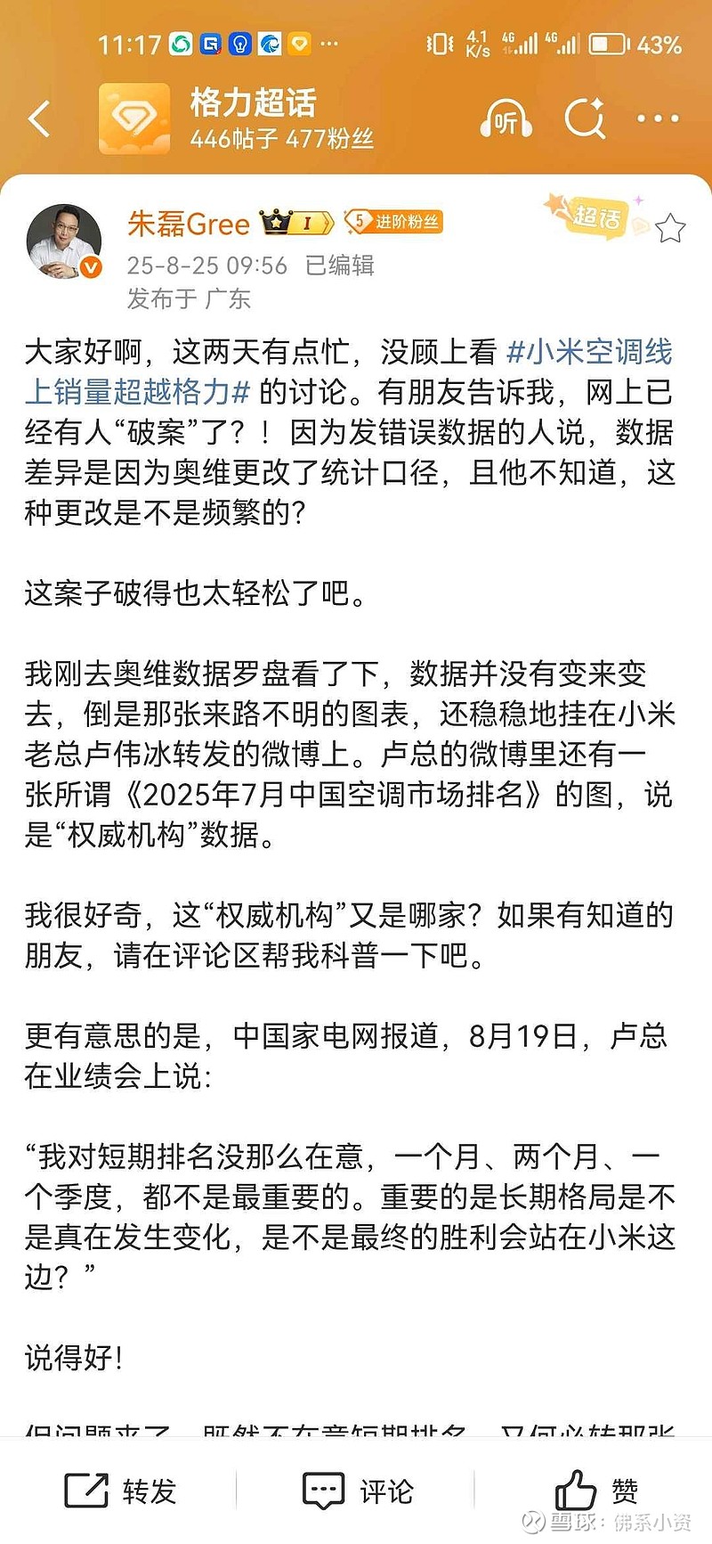 他提到,刚去奥维数据罗盘看了下,数据并没有变来变去,倒是那张来路不明的图表,还稳稳地挂在小米老总卢伟冰转发的微博上。卢总的微博里还有一张所谓《2025年7月中国空调市场排名》的图,说是“权威机构”数据。“我很好奇,这‘权威机构’又是哪家?如果有知道的朋友,请在评论区帮我科普一下吧。”