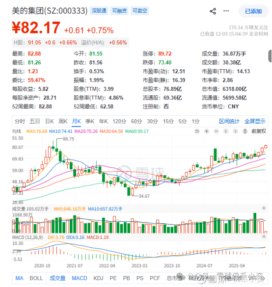 美的集团:不知不觉,股价创四年来新高了。昨天(12月2日)下午,美的集团A股股价一鼓作气冲上81.66元高位,这一价格不仅刷新了2021年以来的最高纪录。今天美的股价表现继续涨。
