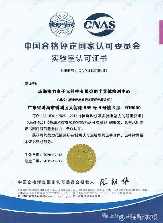 格力半导体检测中心荣获CNAS国家实验室认可证书,检测服务服务行业,欢迎合作咨询:晶圆、封装、板级、系统级失效分析,车规级可靠性测试评估以及电子化学品超痕量分析,助力工艺改善、产品质量和良率提升。$格力电器(SZ000651)$