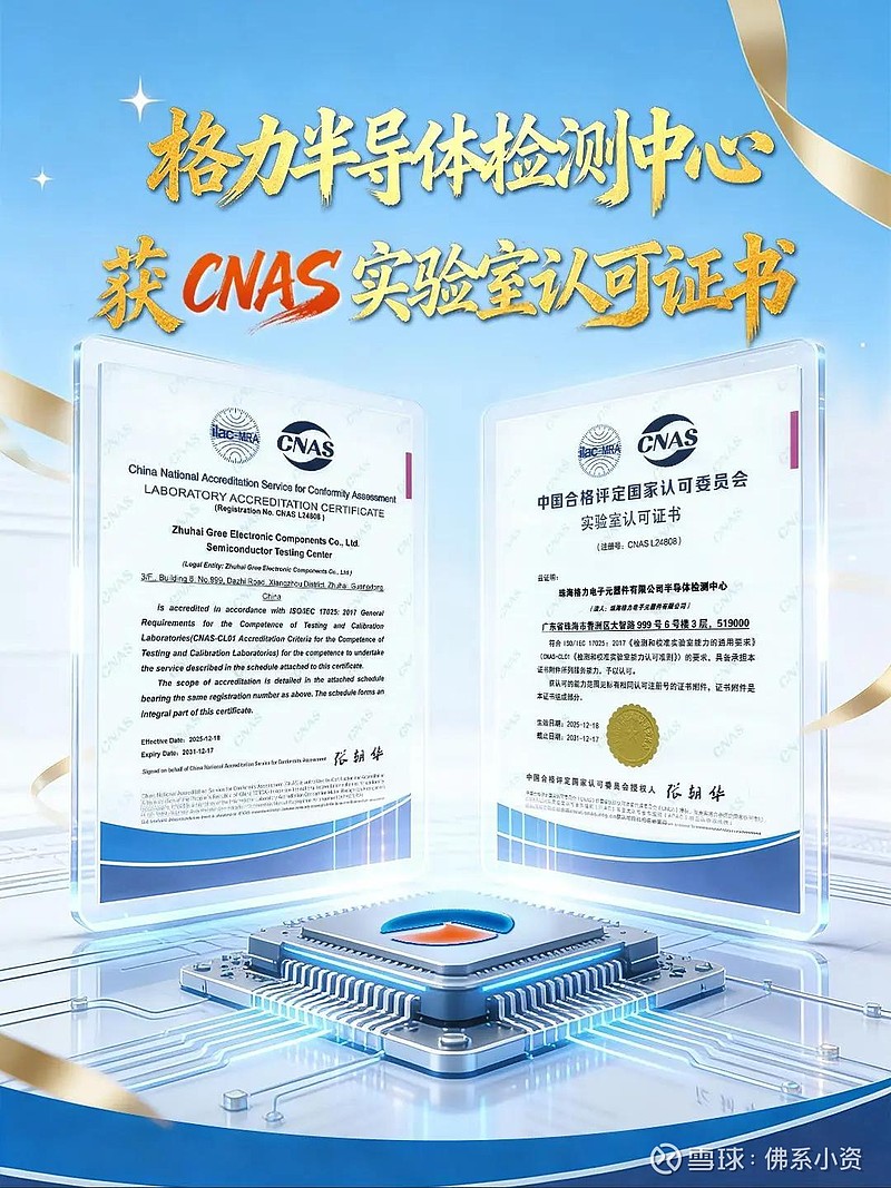 从研发设计到终端应用,格力半导体检测中心为半导体产品全生命周期提供覆盖关键环节的技术保障。此次格力半导体检测中心通过 CNAS 认可,更是对格力半导体业务硬实力与软实力的双重肯定。未来,格力半导体检测中心将持续精进技术能力,在半导体检测领域深耕细作,为产业高质量发展贡献更大力量。$格力电器(SZ000651)$