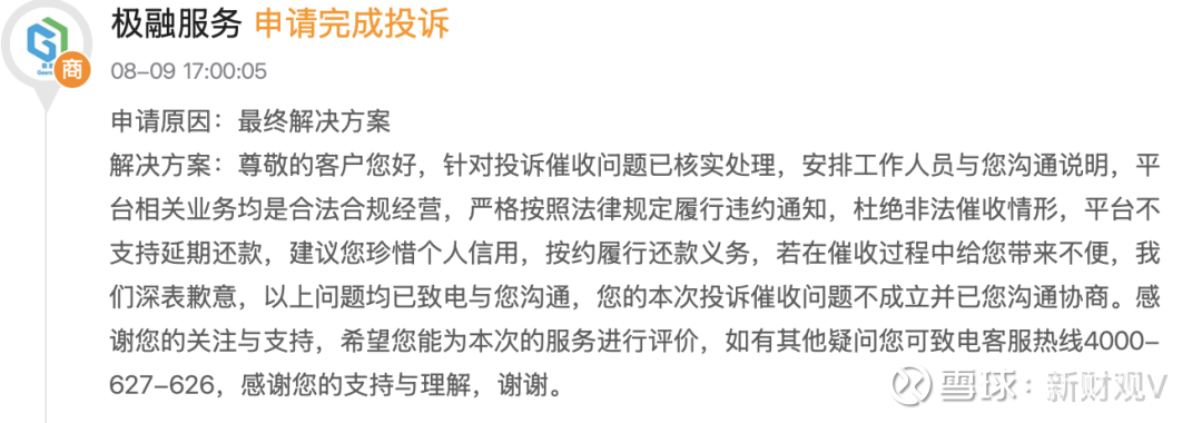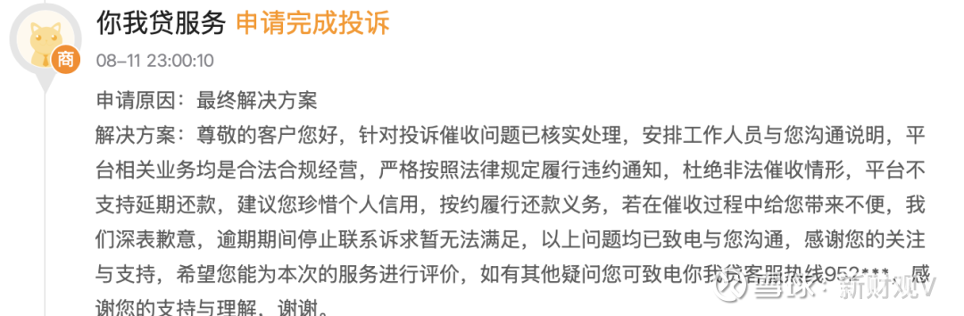 “针对投诉催收问题已核实处理,安排工作人员与您沟通说明,平台相关业务均是合法合规经营,严格按照法律规定履行违约通知,杜绝非法催收情形。”“你我贷”在黑猫平台上十分霸气地回复道,“平台不支持延期还款,建议您珍惜个人信用,按约履行还款义务,若在催收过程中给您带来不便,我们深表歉意,逾期期间停止联系诉求暂无法满足。”