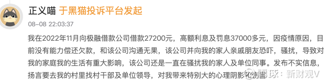 “我在2022年11月向极融借款公司借款27200元,高额利息及罚息37000多元,因疫情原因,目前没有能力偿还欠款。和该公司沟通无果,该公司并向我的家人亲戚朋友恐吓,骚扰,导致对我的家庭我的生活有重大影响。”该用户在投诉中无奈道,“该公司还是一直在骚扰我的家人及单位同事,发布不实信息,扬言要去我的村里找村干部及单位领导,对我带来特别大的心理阴影和伤害。”
