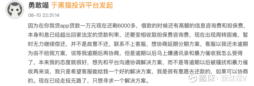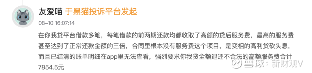 相似的情形,在“你我贷”平台上则更为严重。8月10日,一位用户在黑猫平台投诉称,高额服务费离谱,有砍头息之嫌。