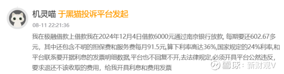 黑猫投诉显示,一位用户在2025年8月,通过极融借款向南京银行贷款6000元,分12期偿还,每期602.67元的还款中含91.5元担保费和服务费。该用户核算下来的实际利率为36%。