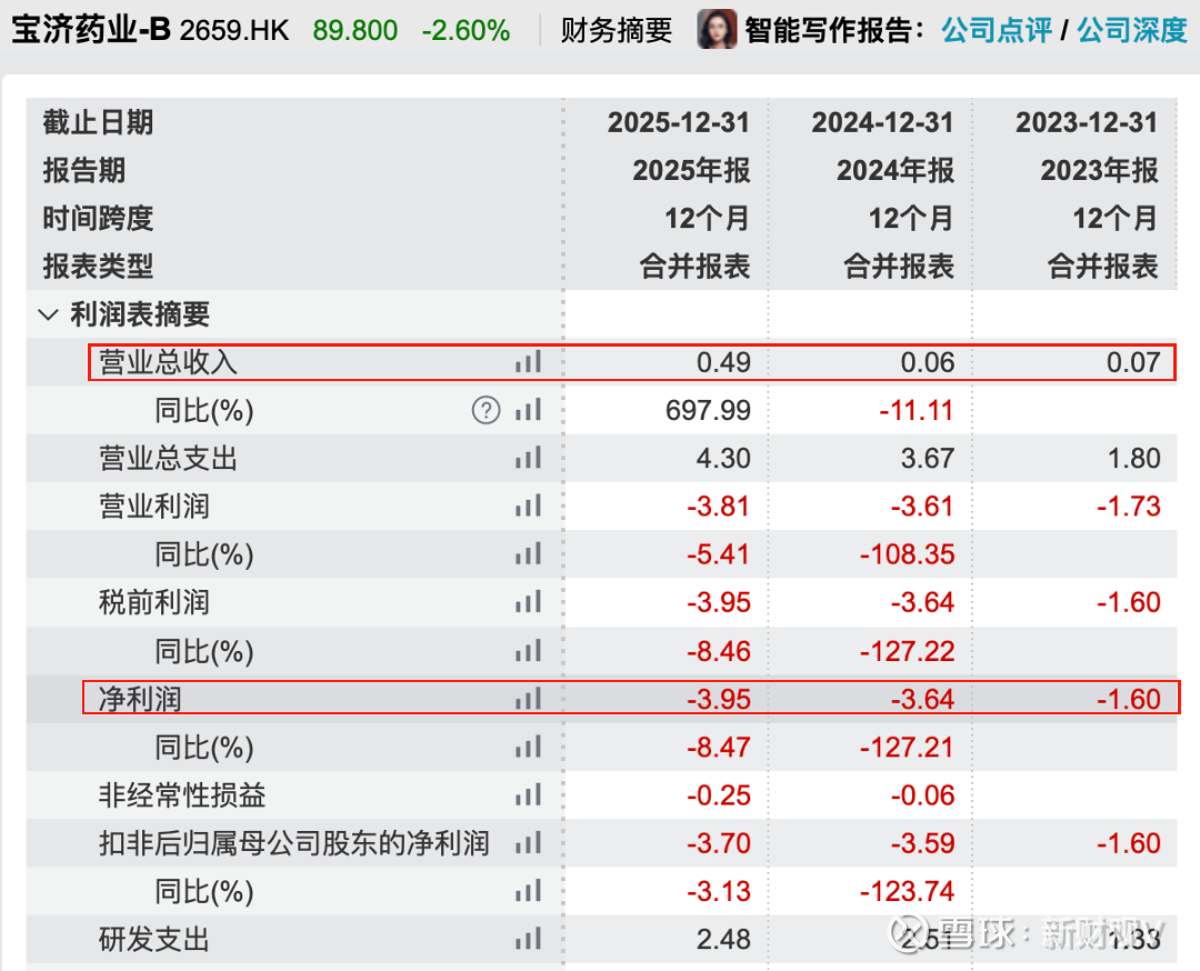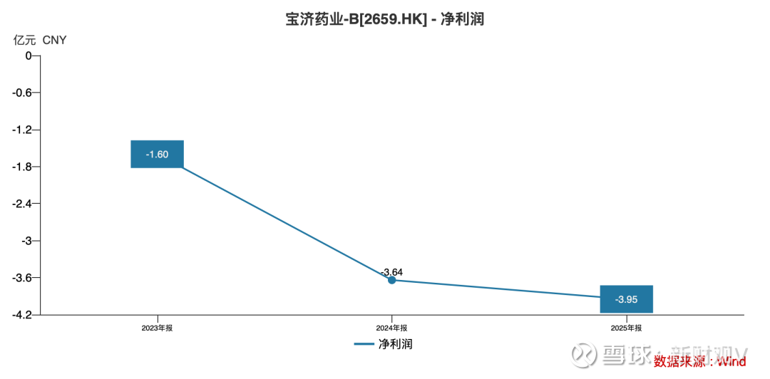 3月26日,宝济药业(02659.HK)发布的业绩公告显示,2025年公司营收仅4916万元,而全年的亏损额扩大至3.95亿元,较上一年度的3.64亿元有所增加,两年累计亏损达7.59亿元。