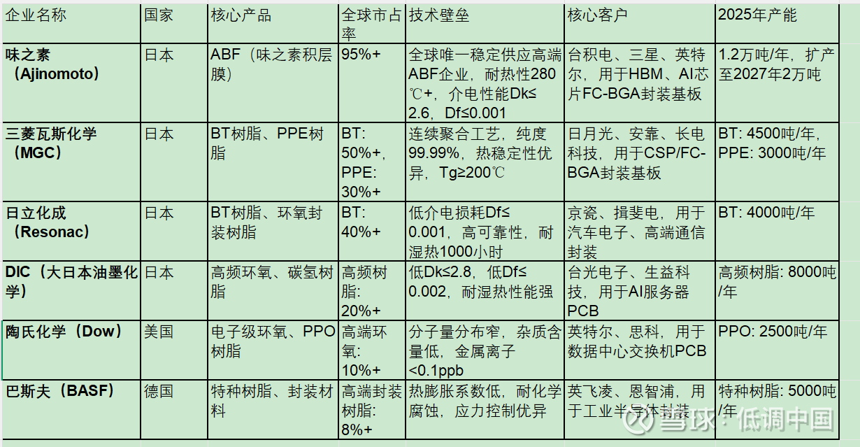 全球高端电子树脂市场呈现日本垄断高端封装树脂、欧美领先高频树脂、国内企业加速突破的格局,味之素(ABF)、三菱瓦斯化学(BT)、东材科技(M9级高频)、圣泉集团(PPO)为细分领域绝对龙头。