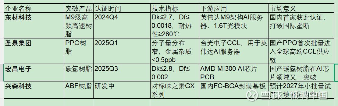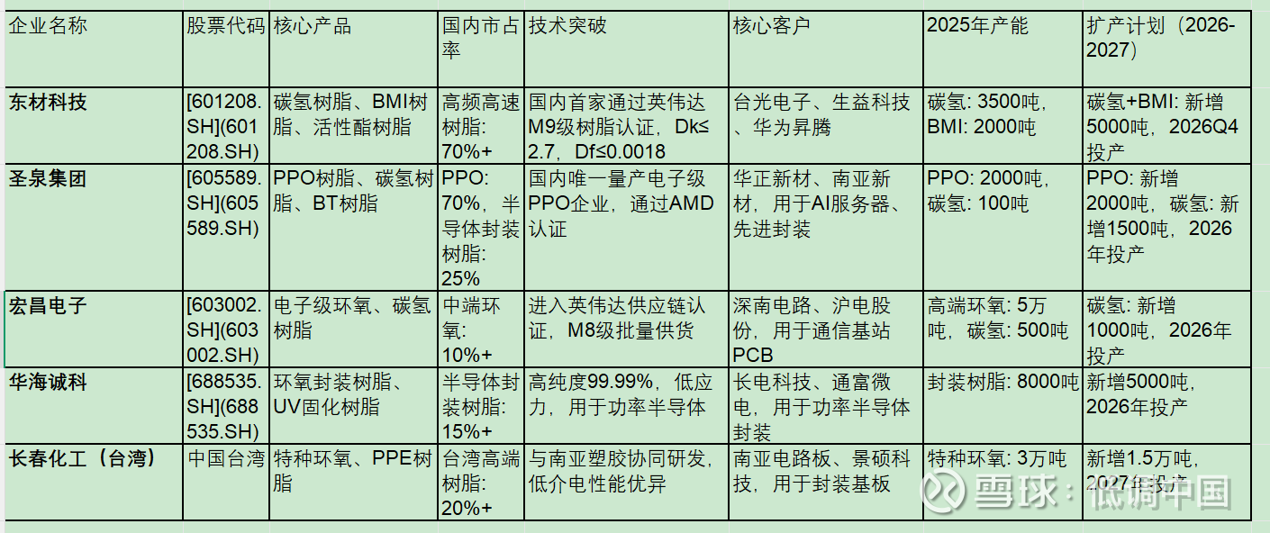 重点企业:东材科技(M9级高频树脂龙头)、圣泉集团(PPO/BT树脂领先)、华海诚科(封装树脂龙头),以及上游核心材料供应商新远科技、万华化学。