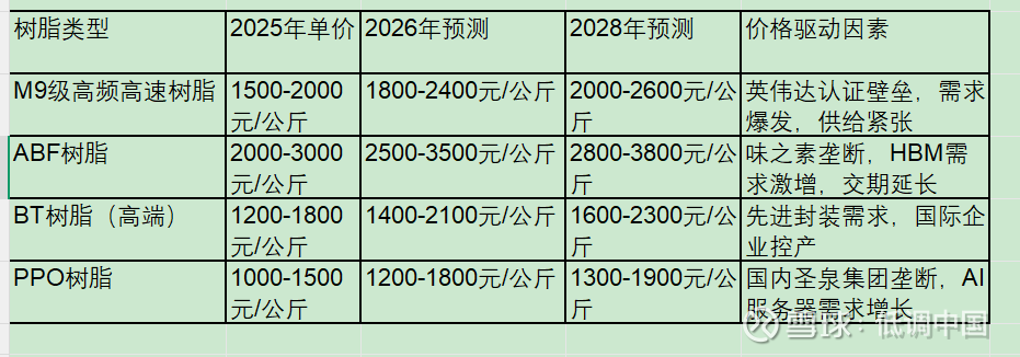 2026-2030年全球高端电子树脂市场年复合增长率达22-25%,其中AI服务器驱动的高频高速树脂CAGR35-40%,先进封装带动的ABF/BT树脂CAGR28-32%。
