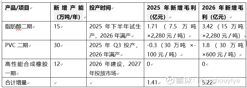 嘉化能源 2025—2026 年新增产能集中在脂肪醇二期、PVC 二期、高性能合成橡胶一期,将显著提升量利空间,具体测算如下: