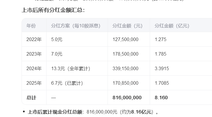 但是截止到当下,已经累计分红8.16亿,这是才上市三年的公司呀,三年呀,在A股中,已经这样分红的公司,请问有几个?吊炸天有没有?即使三年前,你脑子一抽,以当年新股上市时最高点冲进去,拿到现在,除去股价升幅的钱,光分红你就赚了投资额的20%了!如果你低价买入呢?