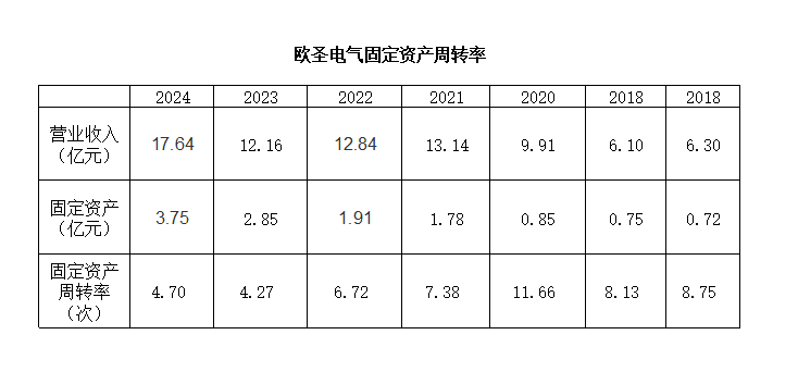 从统计可以看来,欧圣上市前的固定周转率是8次以上,2020年达到11.66元,即100元的固定资产,当年可以带来1166元的营业收入。