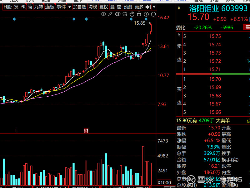 但是现在再看看,整个金属铜板块已经走出了主升,看一下洛阳钼业的图: