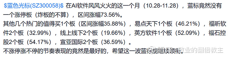业绩上虽不能与易中天纪连海等大牛相提并论,但就板块中军龙头气质上还是有相似之处的。就像周五统计的近期AI软件强势股的阶段表现,蓝标不是最强势的走法,但确是最稳定表现最好的一个,这可能就是中军的气质吧(当然也有可能是个人的主观臆断,盲目乐观罢了)。
