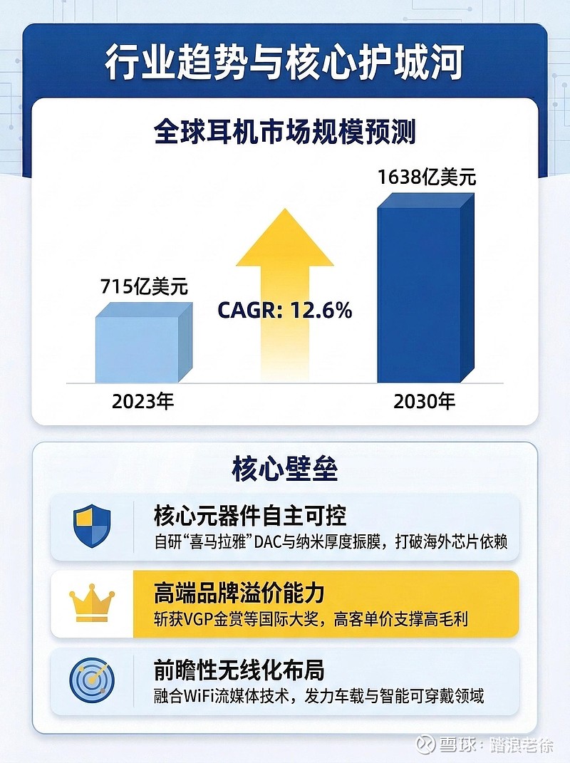 2️⃣高端品牌溢价能力:公司是国内稀缺的高端电声品牌“链主”企业,多次斩获日本VGP金赏、美国CES创新奖等国际专业大奖,品牌深入全球HiFi发烧友圈层,支撑了产品的高客单价与高毛利率。