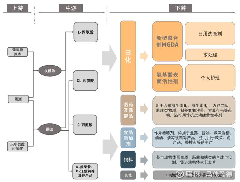 L-丙氨酸产品为丙氨酸系列产品中应用最为广泛的细分类型,可以广泛应用在日化、医药及保健品、食品添加剂和饲料等众多领域。在日化领域,L-丙氨酸是合成新型绿色螯合剂 MGDA 的主要原料,还可用于合成温和氨基酸表面活性剂,其中 MGDA 凭借自然生物降解、螯合能力强、毒理安全、洗涤残留少等多重优点,在欧美等发达国家被广泛应用在日化洗涤产品中;在医药及保健品领域, L-丙氨酸是合成维生素 B6、丙谷二肽等的原料,作为营养强化剂或补充剂;在食品添加剂领域,L-丙氨酸具有特殊的甜味和鲜味,其甜味是蔗糖的 1.2 倍,能与其他呈香味的物质混合显出更高级的香味;在饲料领域,L-丙氨酸可以促进动物生长,缓解应激以及预防疾病,增 强免疫和生糖能力,还可增强饲料鲜味,柔和口感,起到良好的诱食作用。