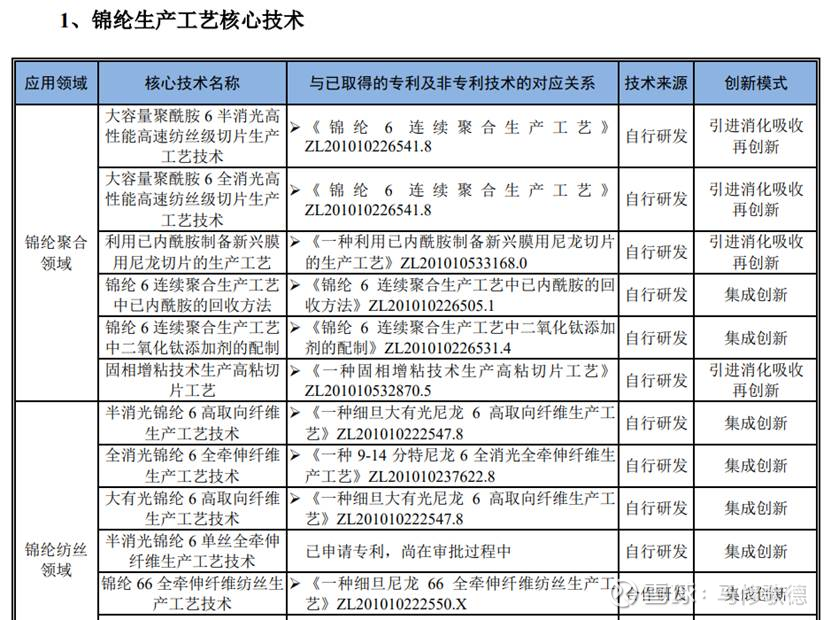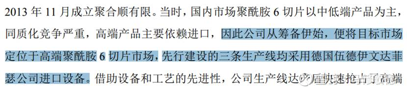 聚合顺自成立起便定位于高端尼龙6切片市场,采用德国制造的尼龙 6 切片制造设备及技术,并与北京三联签订了配套聚合设备供货合同,建成了先进的生产设备体系,为公司业务的飞速发展奠定了硬件基础。在公司成立后,依托公司核心研发团队积累的技术研发 优势,吸收消化伍德伊文达菲瑟公司技术和工艺,融合企业自主技术及工艺,由伍德伊文达菲瑟公司和北京三联虹普新合纤技术服务股份有限公司定制设备,使公司项目整体技术、产品质量优于同行业大多数企业。(聚合顺)